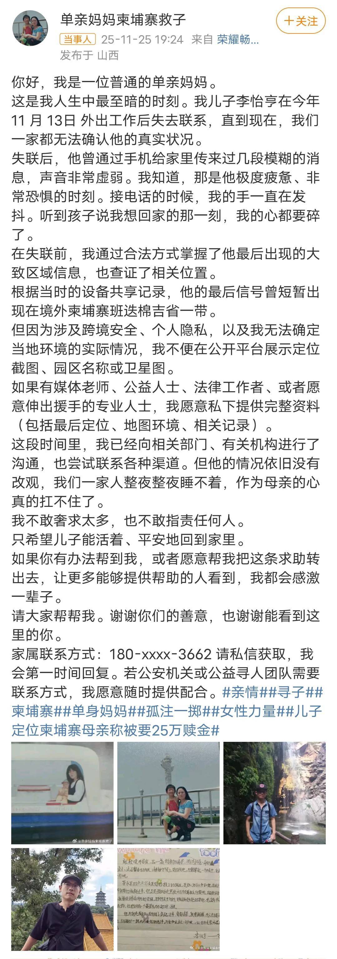 李怡亨母亲(微博账号@单亲姆妈柬埔寨救子)称已通过正当道路掌捏定位信息,但因跨境安全及阴私风险,未便公开具体园区称号或卫星图。她向中柬干系部门乞助未果,恒久失眠且“心力交瘁”。