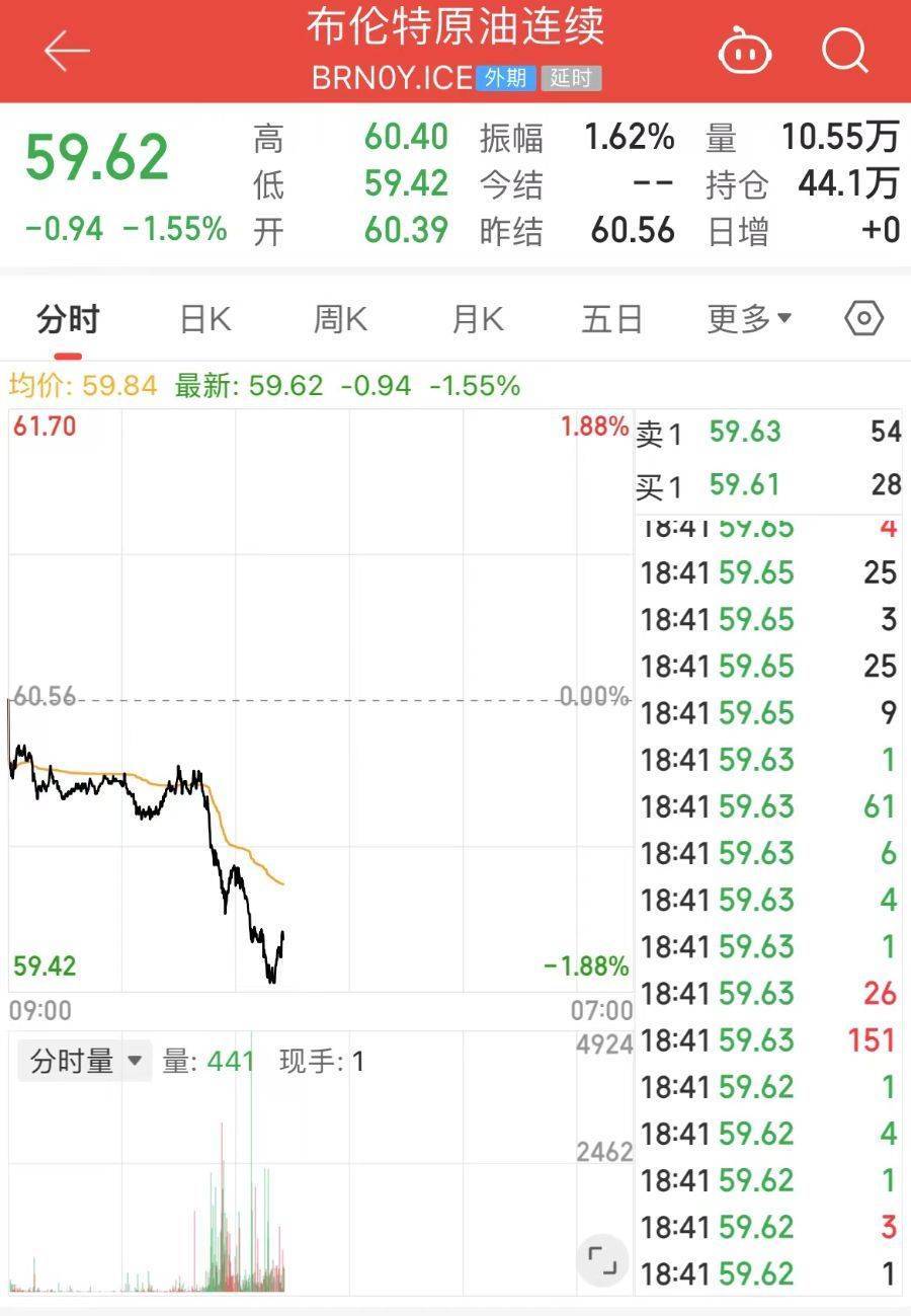 12月16日,海外原油期货价钱瞬息直线跳水,ICE布油盘中跌幅超1.5%,失守60好意思元关隘,为5月以来初度。为止当日18:52摆布,ICE布油报59.62好意思元/桶;WTI原油报55.81好意思元/桶。
