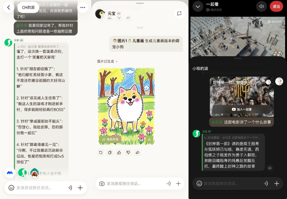 与主流的单一交互的Chatbot(对话机器东说念主)不同,腾讯对“元宝派”的定位更像一个多东说念主酬酢空间。在这个空间中,用户不错让AI参与聊天、调遣氛围、践诺任务等。此外,元宝还不错充住持庭空间的智能助手,用户在“元宝派”中成就定时教唆任务,发起举例看书、通顺等打卡行径;元宝派还接入了腾讯会议的音视频底层才略,让用户和好友沿途听歌、不雅影等。