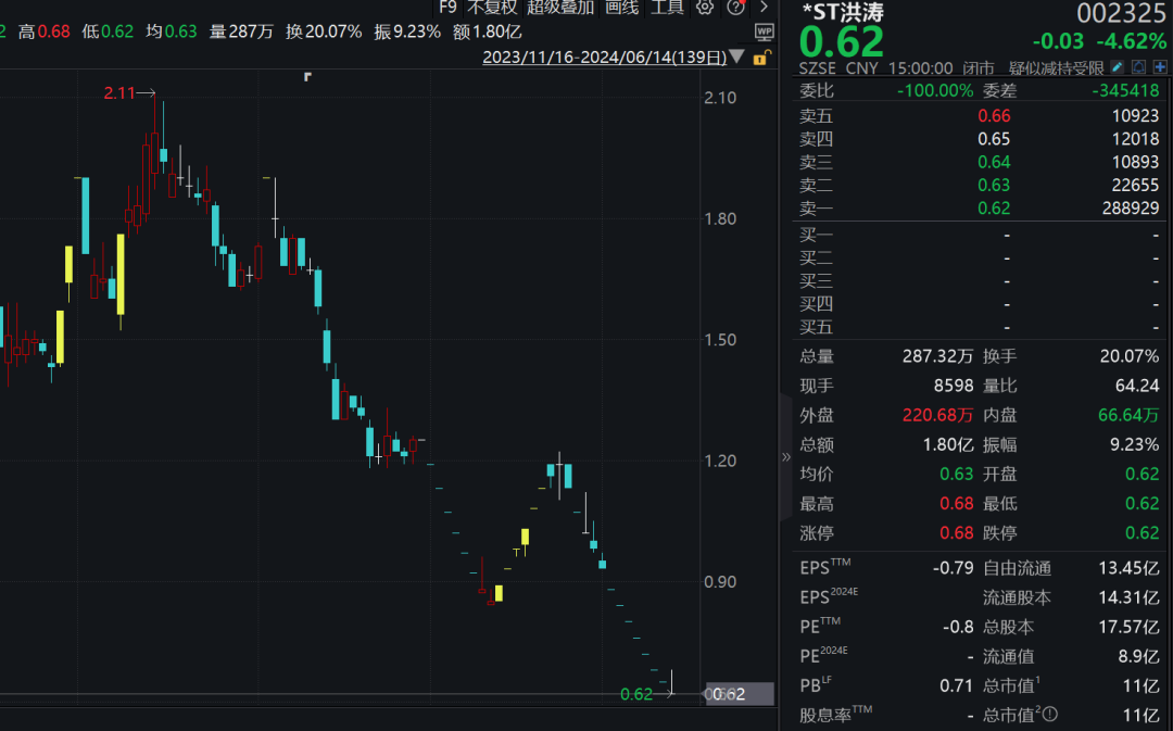 股价已贯穿10天低于1元/股的*ST洪涛(002325), 面值退市紧箍咒高悬在头顶。