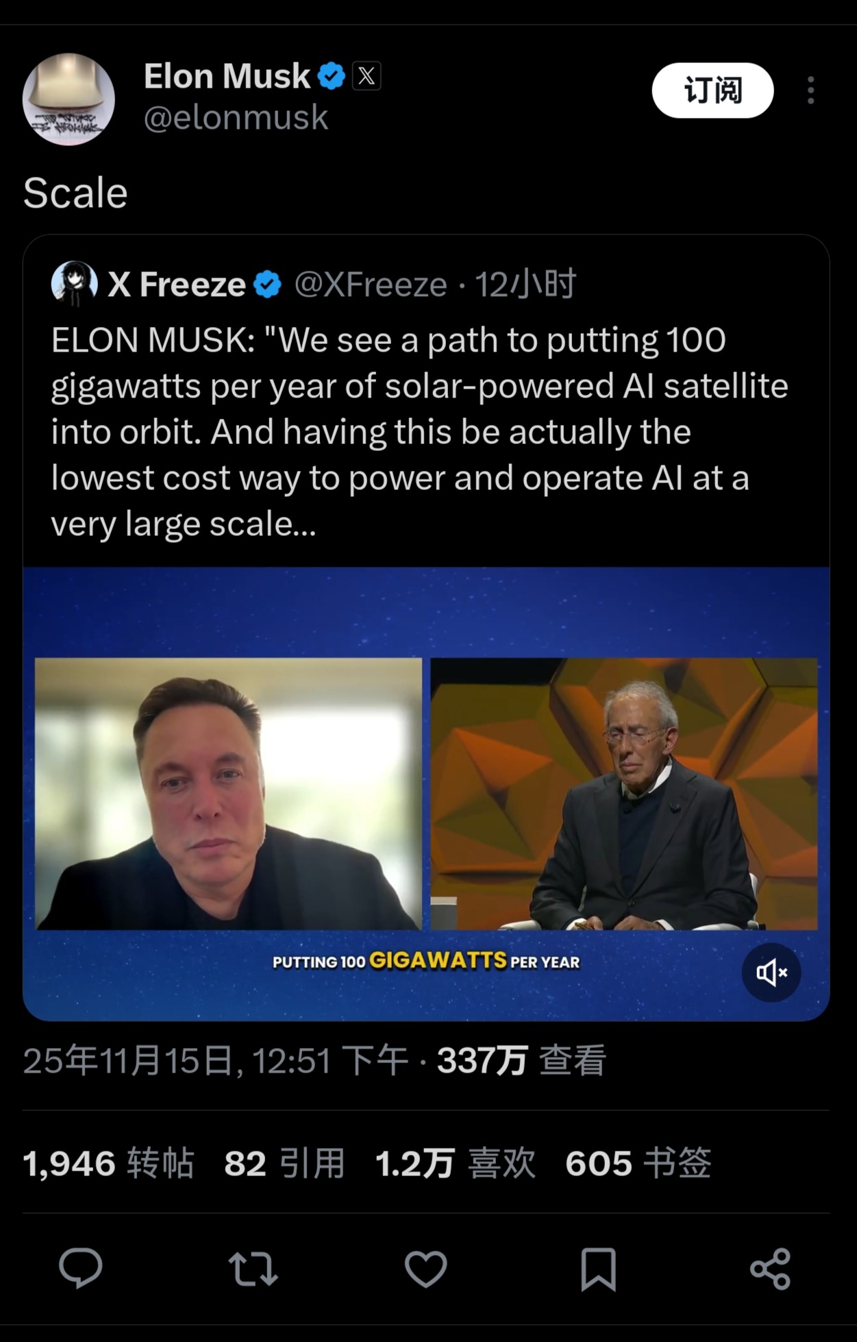 好意思国当地技巧11月14日,马斯克在X上转发了一位网友共享的他最近秉承罗恩.巴伦采访的视频。马斯克在采访中说:“咱们看到了一条可行的旅途,简略每年将100吉瓦的太阳能驱动的东说念主工智能卫星送入轨说念。况且这种模样骨子上简略以最低的资本大鸿沟驱动并驱动东说念主工智能。”