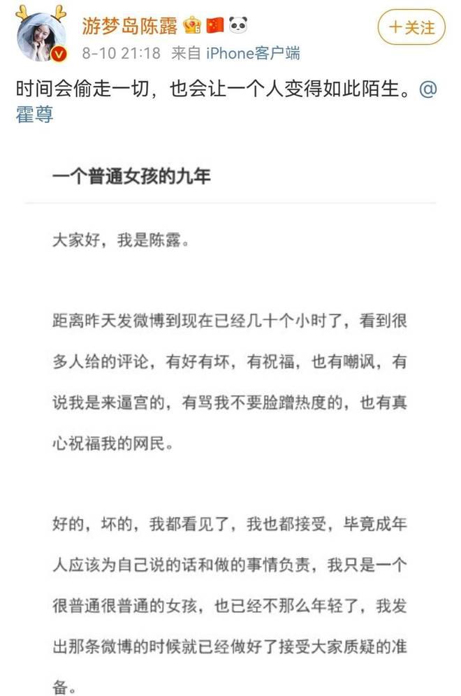 这一年的 8 月,霍尊一会儿被前女友陈露发文控诉。